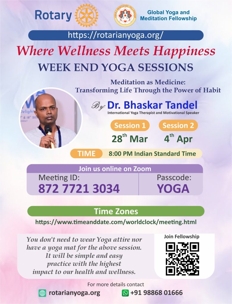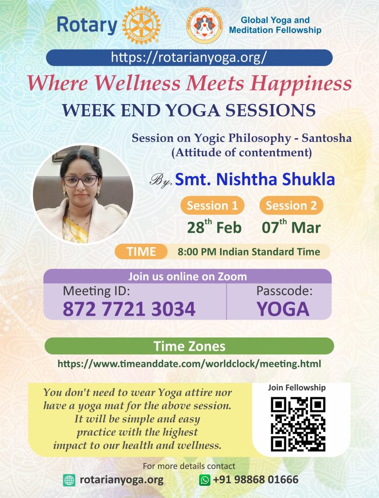 Join the Rotary Global Yoga & Meditation Fellowship for a powerful weekend session on Santosha — the Yogic Attitude of Contentment.
